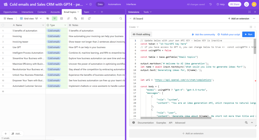 A powerful and user-friendly template designed to streamline your customer relationship management (CRM) and email marketing efforts. By harnessing the power of GPT-4 and Airtable, this product enables you to manage your CRM within Airtable, efficiently respond to incoming emails, and schedule targeted cold email campaigns for potential customers.