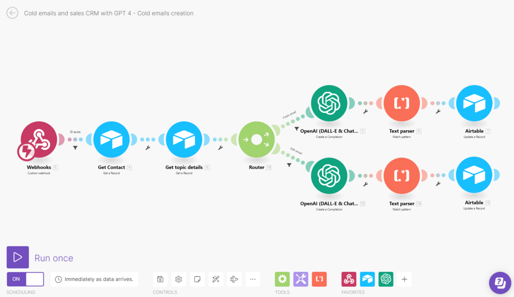 Our Sales CRM and Cold Emails with GPT-4 and Airtable product is built on four main elements, also known as Make blueprints, which link seamlessly with your Airtable base.